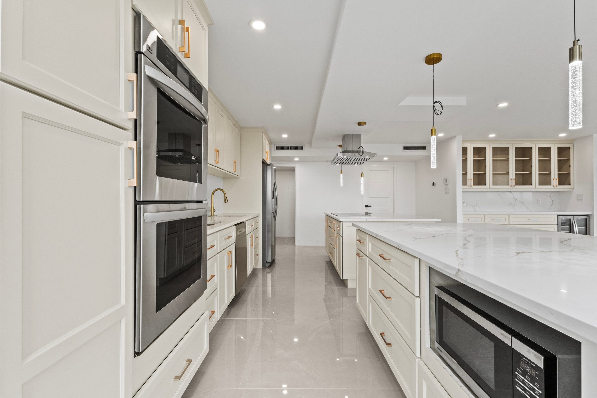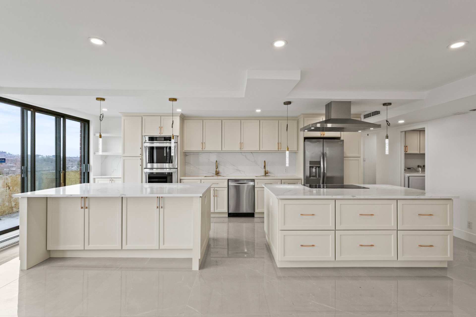 cuisine de chef comprenant deux vastes îlots en quartz avec