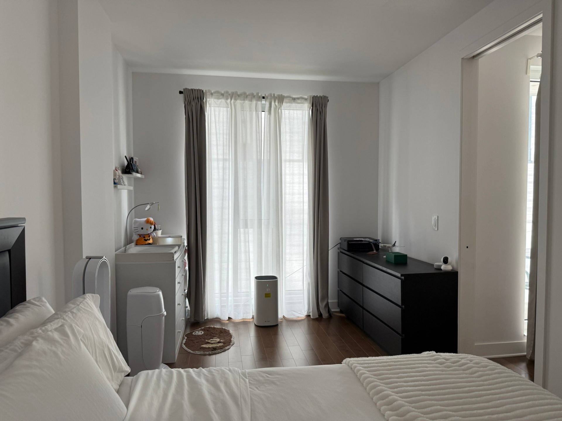 rideaux, lit, 2 tables de chevet et lampes, canapé,