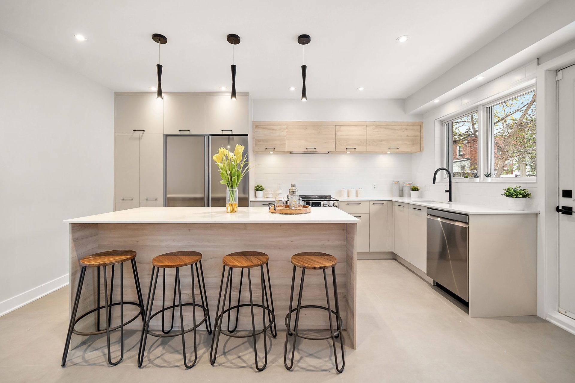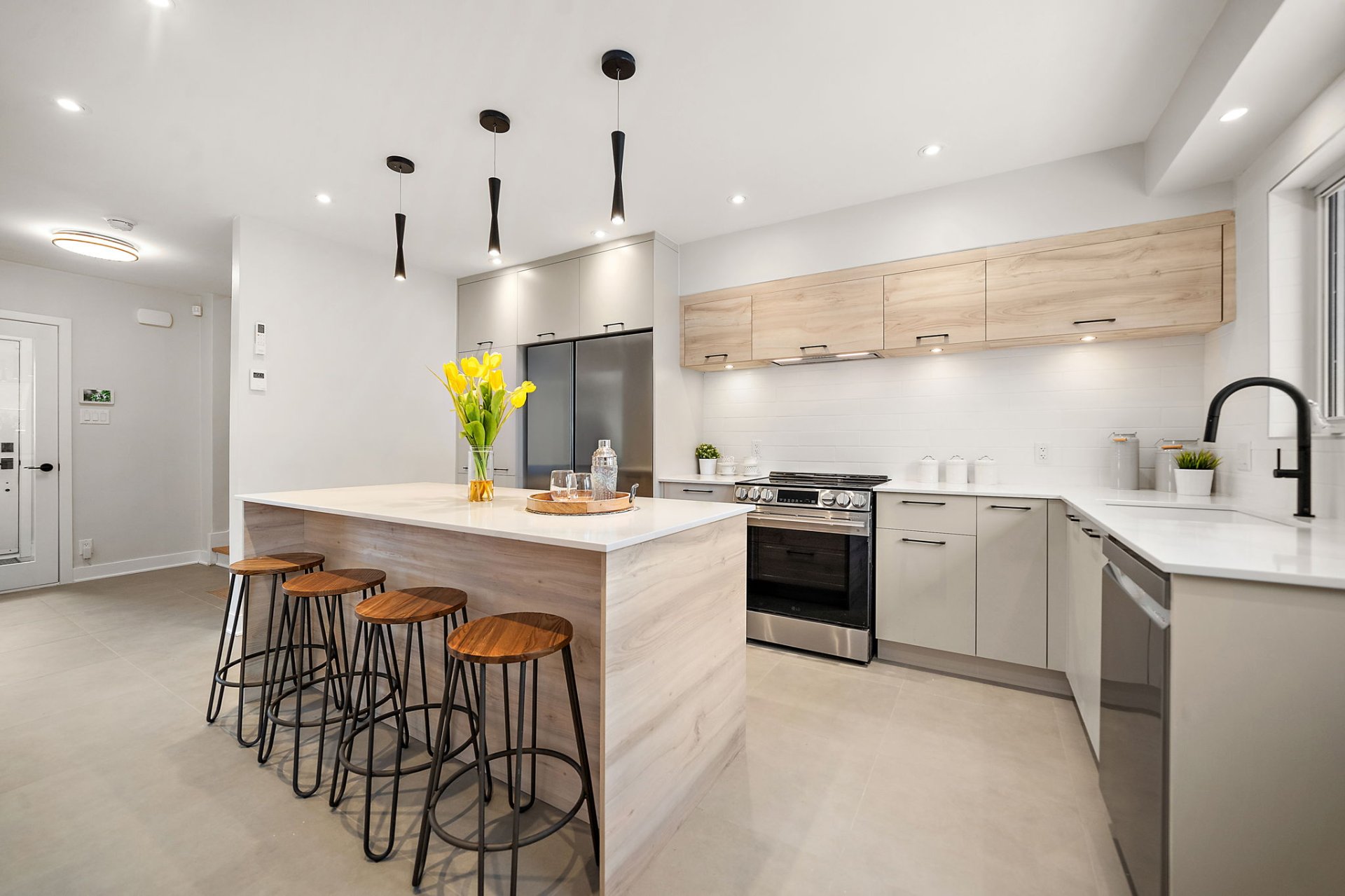 Réfrigérateur, congélateur, cuisinière, lave-vaisselle tous de marque LG de couleur acier inoxydable,hotte encastrée couleur acier inoxydable et luminaires.